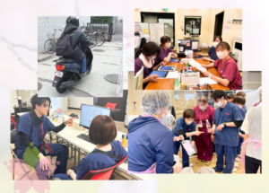 09:00 午前中の訪問(2〜3件) 社用車や電動自転車、バイクで訪問。バイタルチェック、処置、清拭など。(不安なことは電話で管理者に相談)